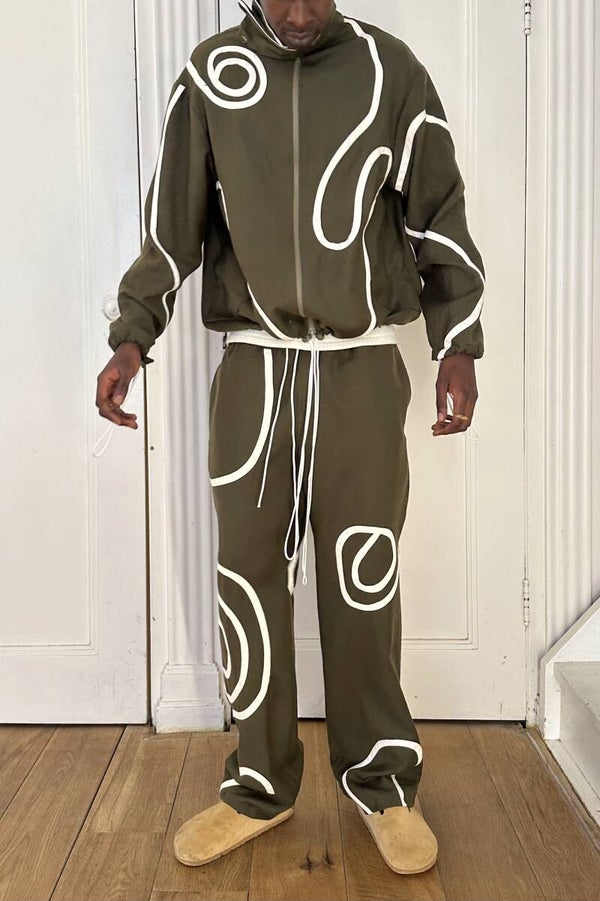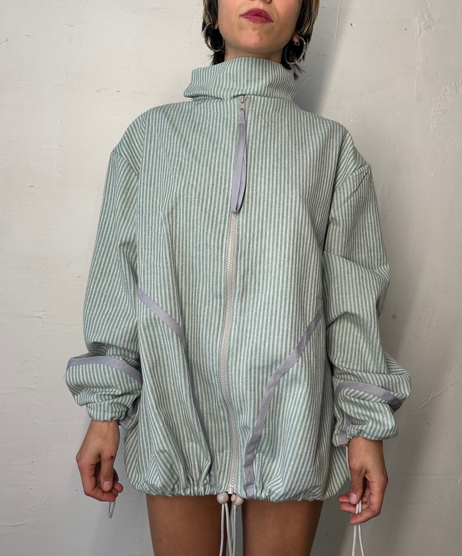 Dark green: A soft wool jack with white graphic lines, the jack has a balloon fit, adjustable with ropes.
