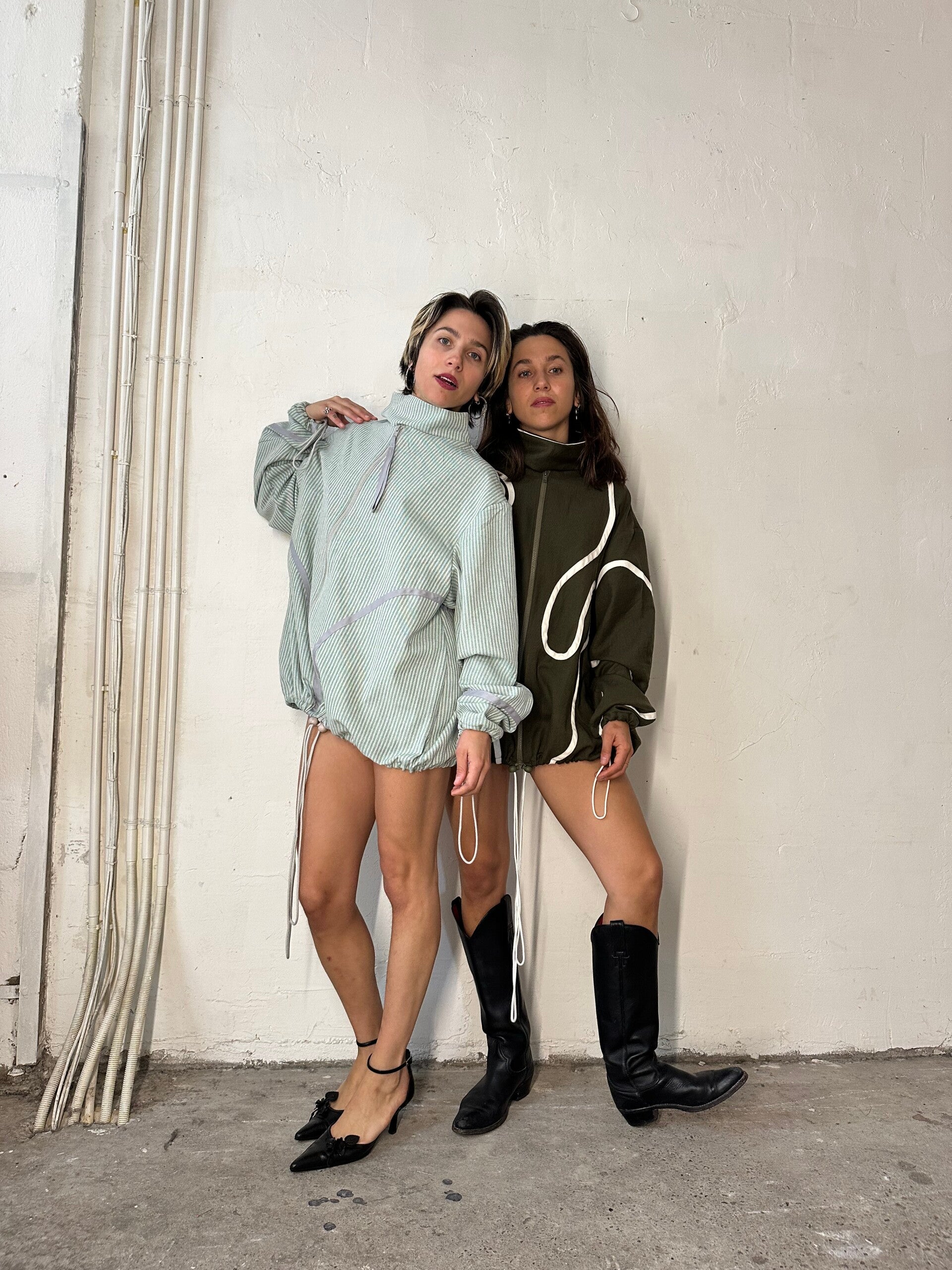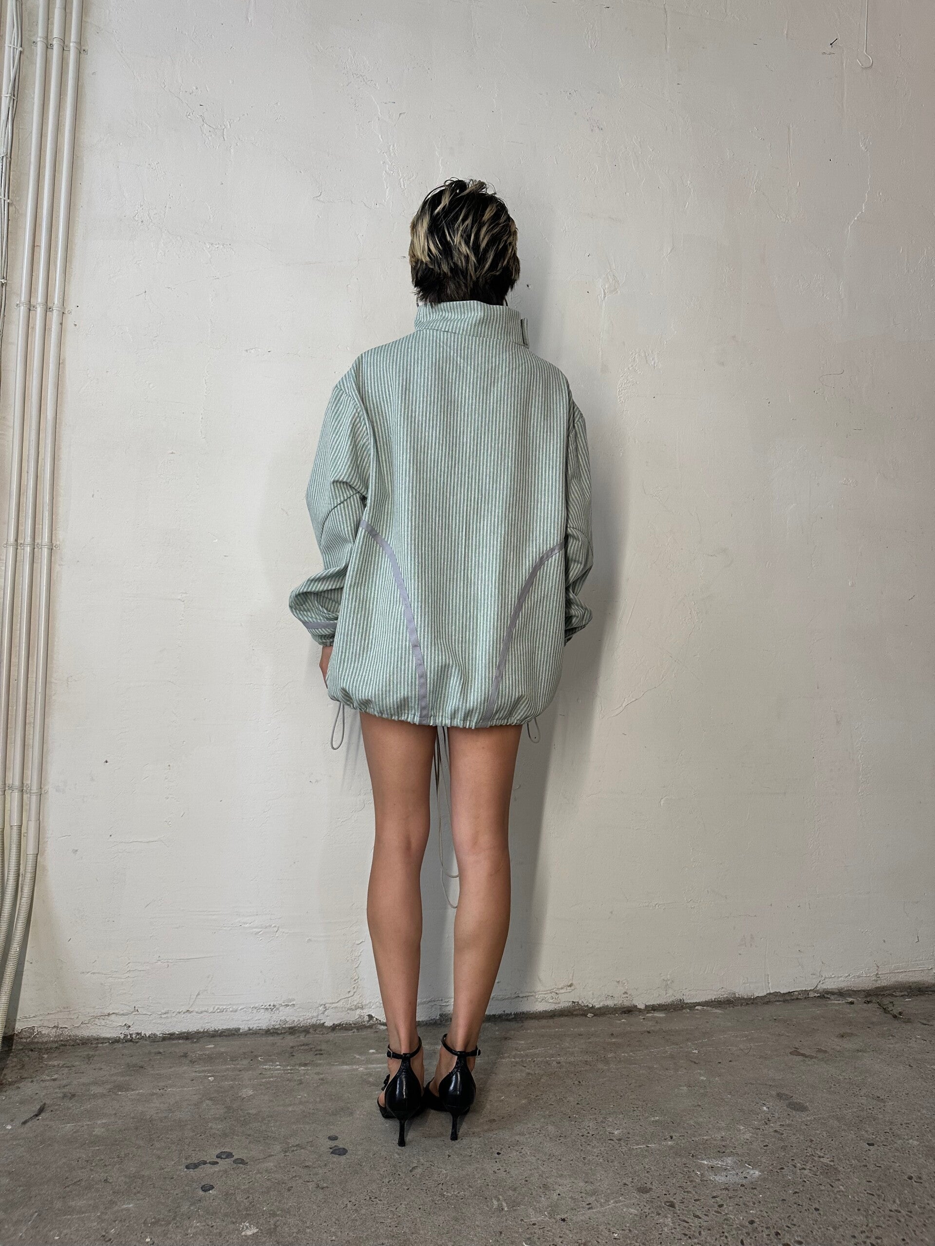 Light green: A heavy cotton striped jack with graphic grey lines, the jack has a balloon fit, adjustable with ropes.