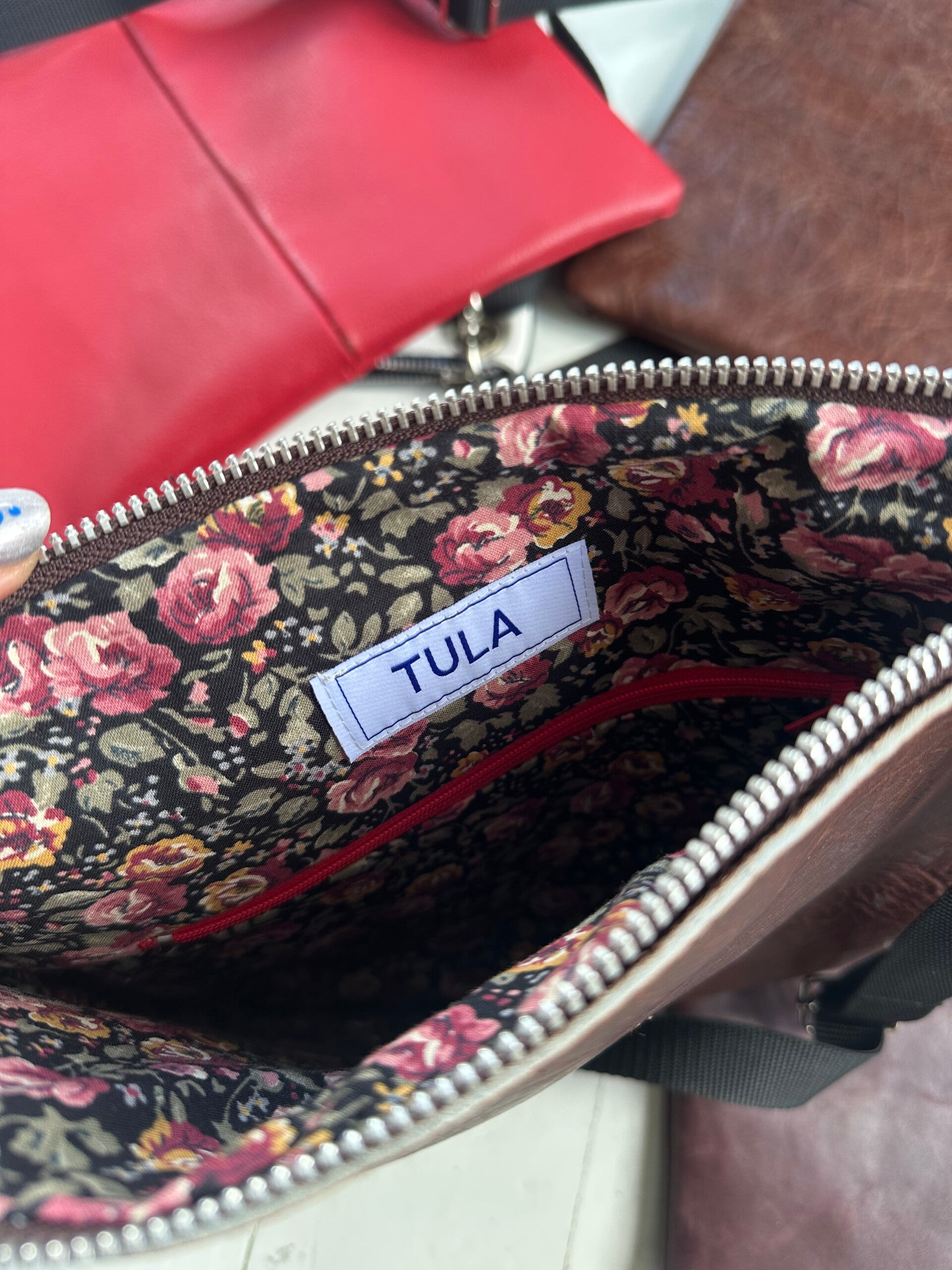 Bags made from deadstock leather with a colourful lining and a inside pocket to fit all your stuff. The strap is adjustable
